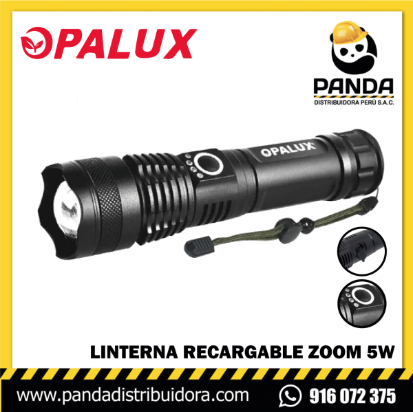 LINTERNA RECARGABLE ZOOM 5W “OPALUX”, 5 MODOS DE ENCENDIDO, ZOOM, CARGA TIPO C Y ADAPTADOR PILA AAA